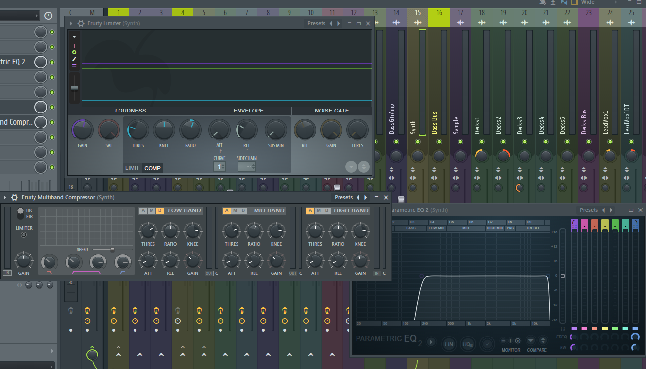 The synth bass does a lot of sweeps into the higher frequencies which interferes with the vocals and drums, so I compressed it pretty hard with a multiband. There is a sub bass that plays along with the synth, so I used a low cut to remove any potential phase issues.