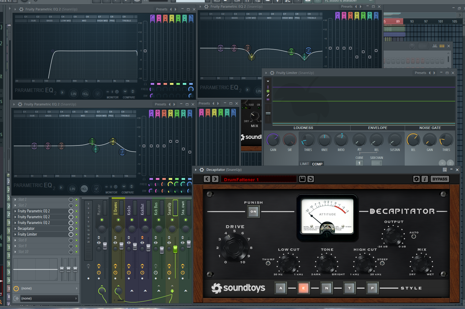 The snare was pretty consistent but lacked any presence. I routed some of the drums to a parallel compressor track that had a really high ratio to add a tail to the snare and other elements.